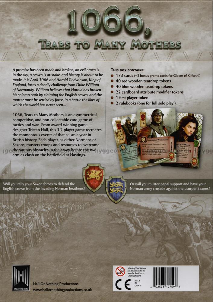 1066, Tears to Many Mothers är ett asymmetriskt, taktiskt kortspel i stil med Magic: The Gathering, men utan sistnämndas element med samlingskort. Spelarna representerar saxarna respektive normanderna och ska först rekrytera trupper och övervinna de hinder som står i vägen innan de två arméerna kan mötas på slagfältet vid Hastings.