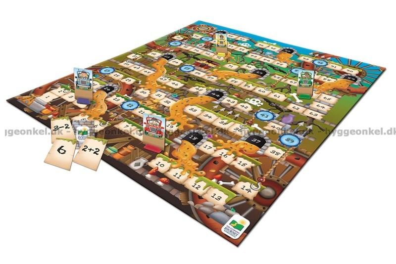 Man drar ett kort och löser matematikuppgiften. Talet ger hur många fält man får flytta sig fram på spelbrädet.