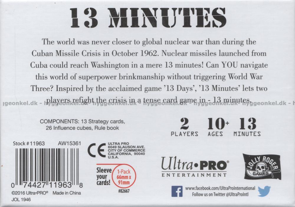 Världen har aldrig varit närmare ett globalt kärnvapenkrig än under Kuba-krisen i oktober 1962. Stridsspetsar med kärnvapen avfyrade från Kuba var bara 13 minuter bort från Washington! Kan du navigera genom stordiplomatin mellan stormakterna utan att starta Tredje världskriget? Spelet är inspirerat av kritikerrosade "13 Days" och låter två spelare återuppleva krisen i ett spännande kortspel som löper över just 13 minuter.