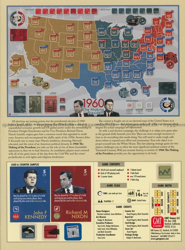1960: The Making of a President är ett spännande strategispel i vilket man kan komma riktigt nära den amerikanska valkampanjen för presidentskapet 1960 och därmed få inblick i några av de huvudelement som bidrog till att forma kampanjen.