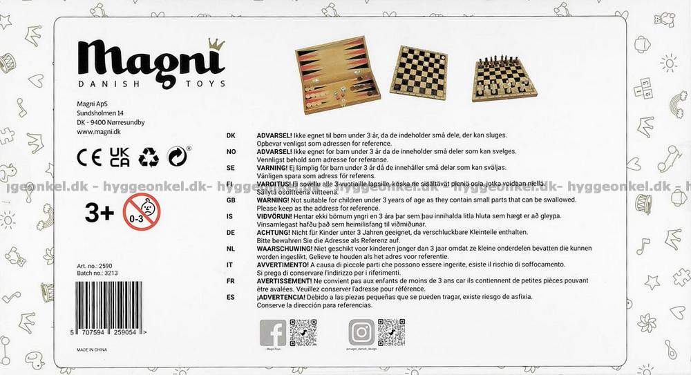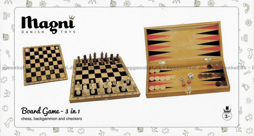Här hittar du 3 av de mest klassiska spelen i en låda. Lådan kan fällas ihop och stängas med ett spänne för smidig förvaring.