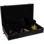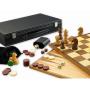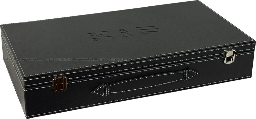 Här är en hopfällbar ask (svart portfölj) full av pjäser till schack, dam och backgammon.
