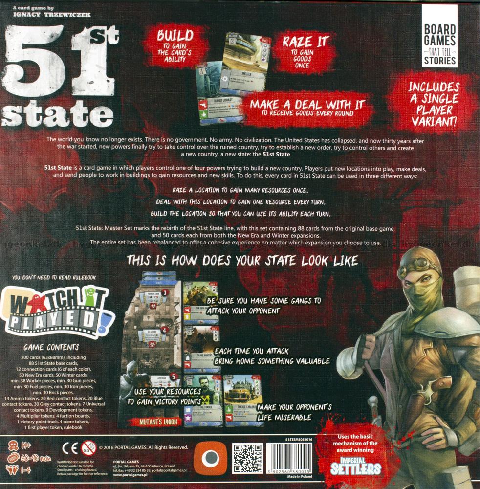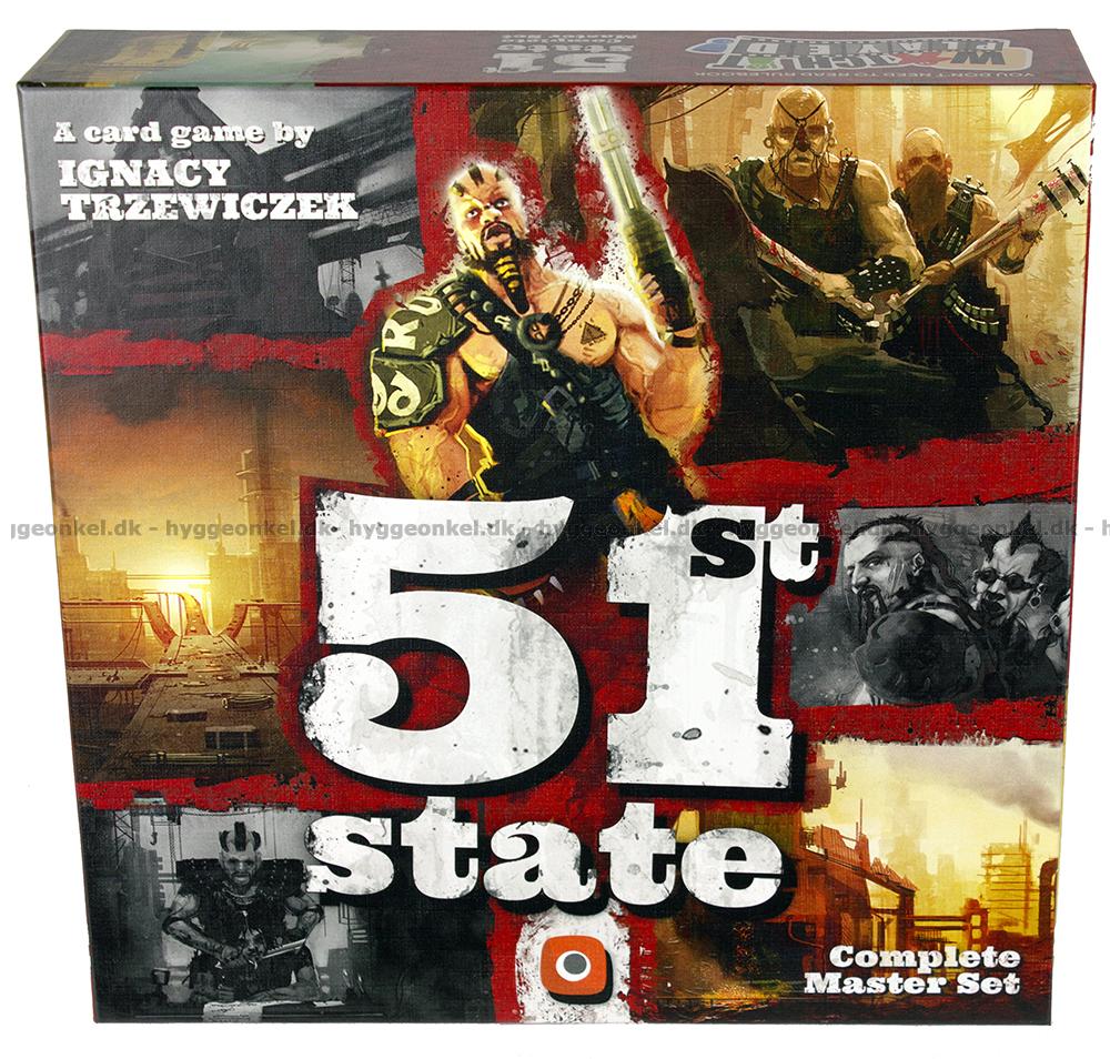 51st State: Master Set markerar återfödelsen av spelserien 51st State. Detta set innehåller 88 kort från det första grundspelet och 50 kort från var och en av New Era- och Winter-expansionerna. Ni kan använda en av expansionerna tillsammans med grundspelet åt gången, men inte båda. Hela setet har balanserats så att det ger en utmärkt spelupplevelse, oavsett vilken expansion ni väljer.