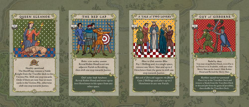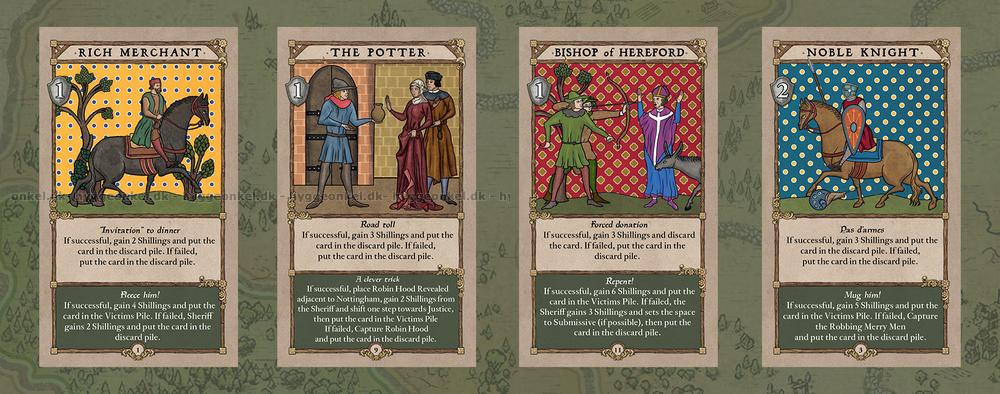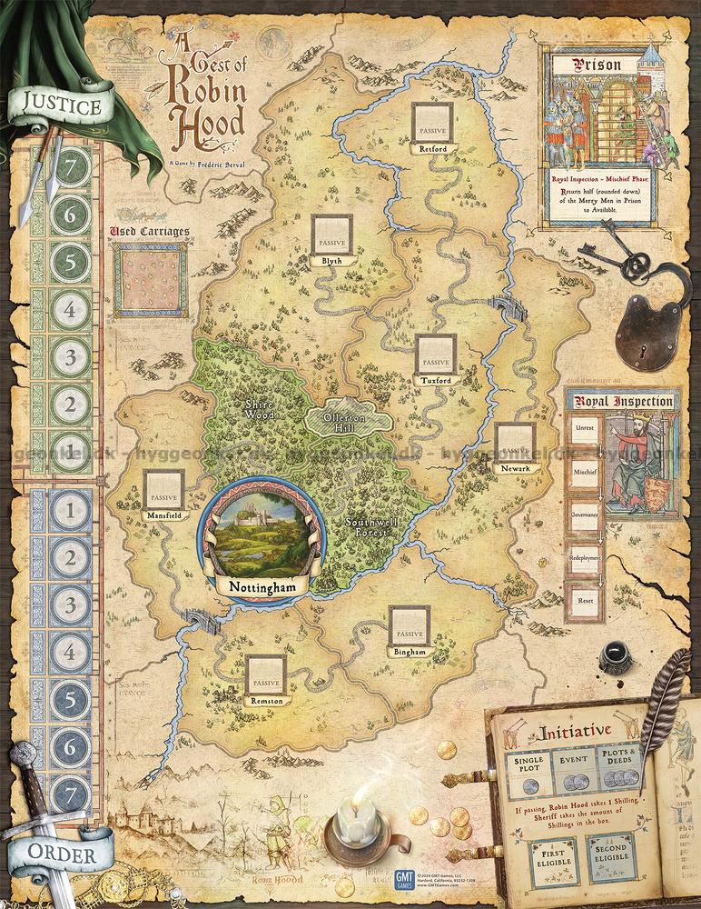 Spelbrädet visar Nottinghamshire uppdelat i socknar, skogar och staden Nottingham. Spelarna använder kort för att utföra handlingar, rekrytera folk, råna resande och hantera händelser, beroende på deras mål om rättvisa eller ordning. Spelet är rikt på strategi och utmaningar, och det är perfekt för dem som älskar historiska och mytologiska teman.