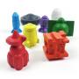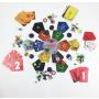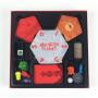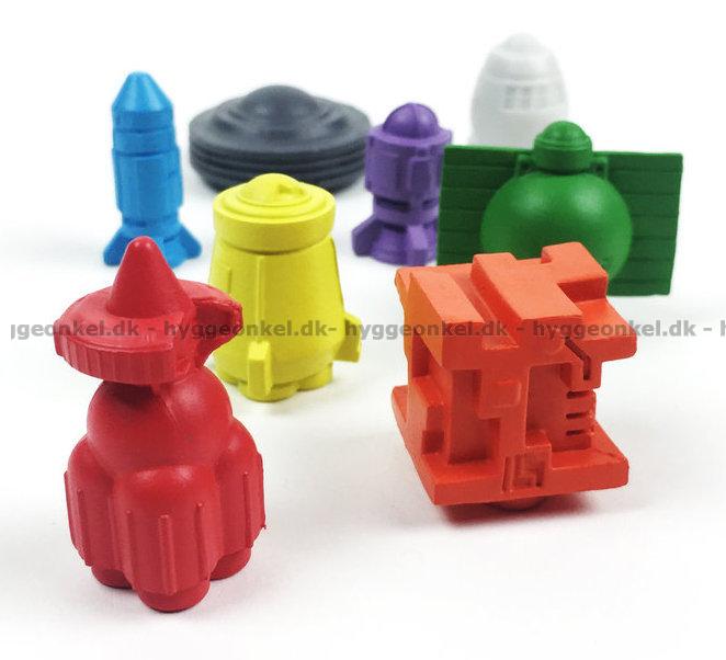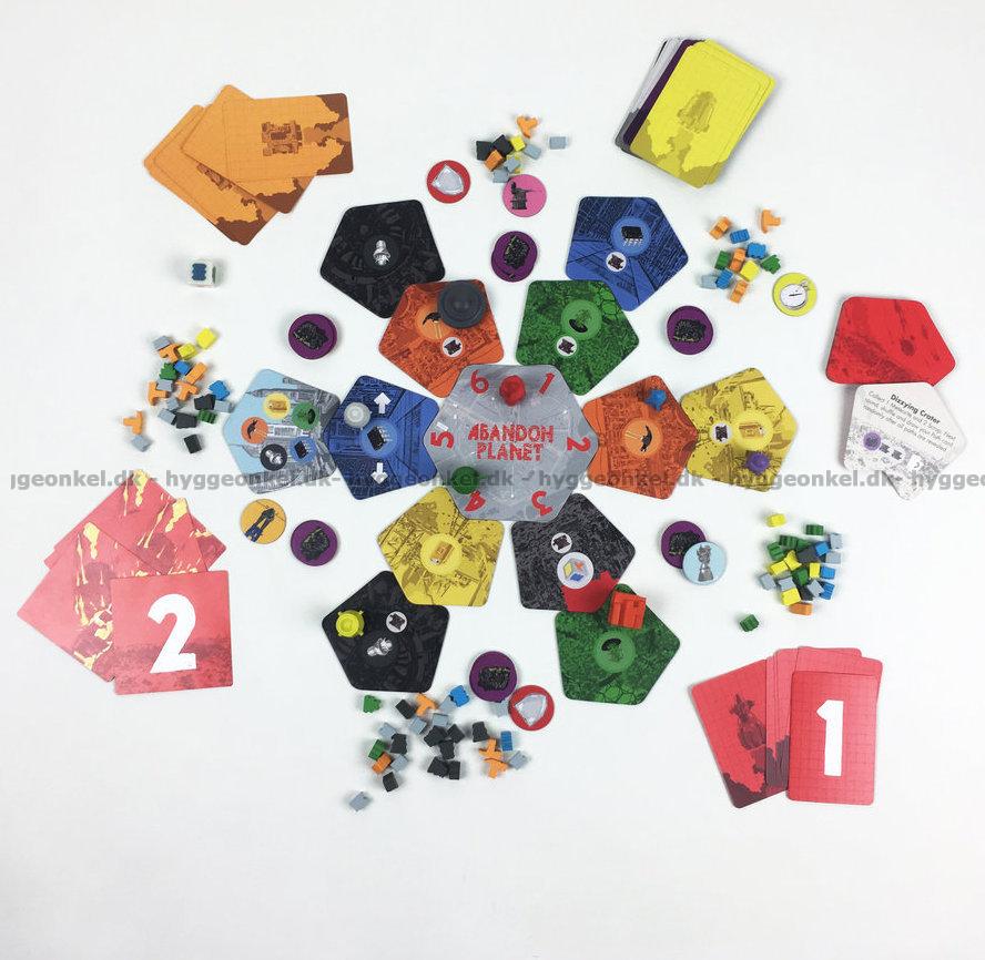 Kort, brickor i kartong, figurer, marker och en tärning.