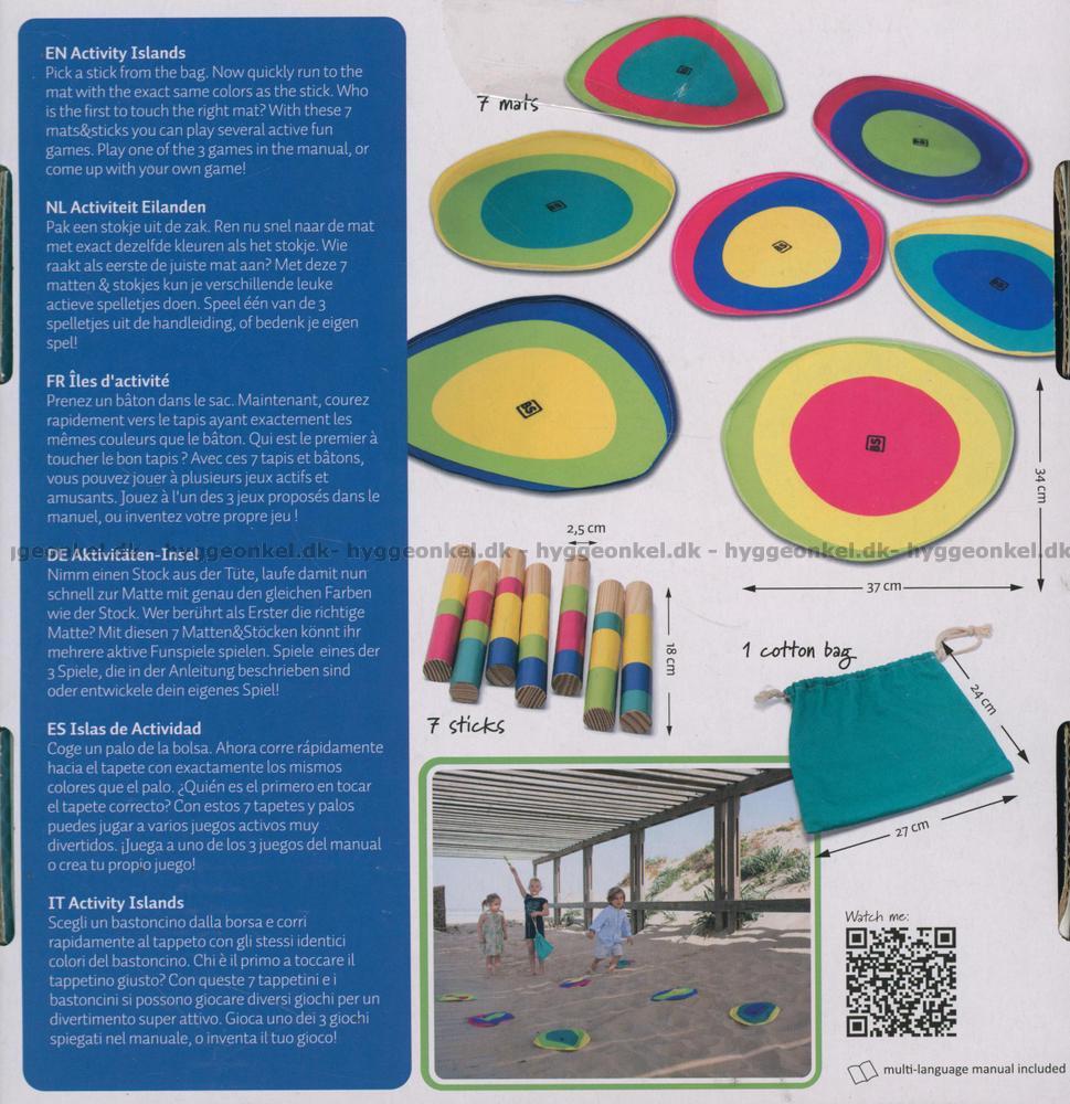 7 mattor (mäter ca 34 x 228 cm), 7 träpinnar (mäter 18 x 2,5 cm) och en förvaringspåse.