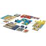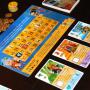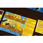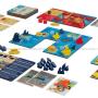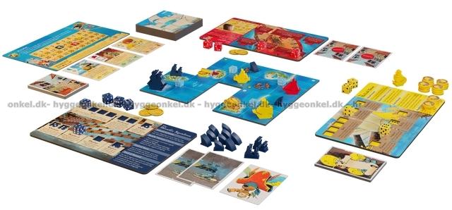 Spelområden, kort, pjäser i trä, marker i kartong och tärningar.