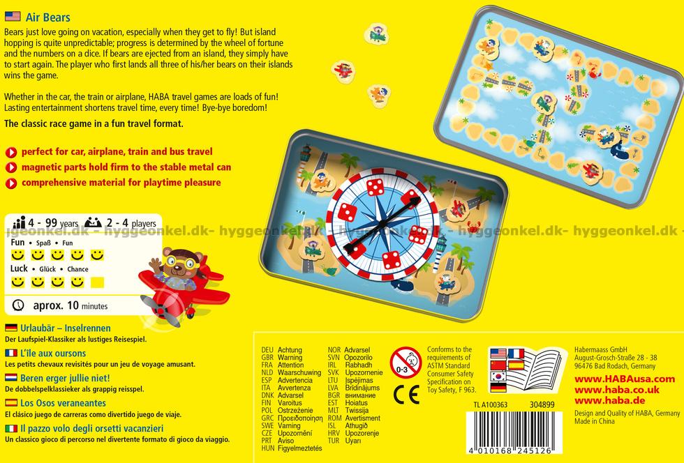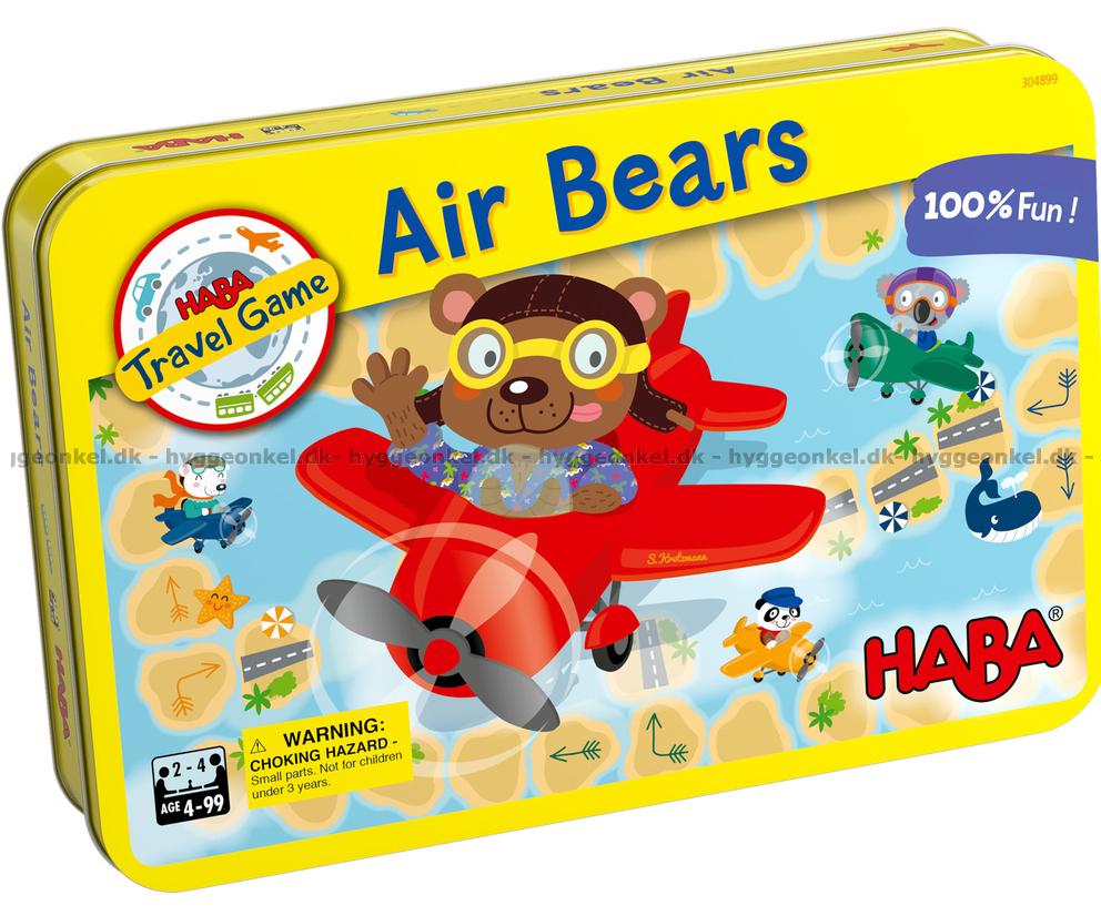 Air Bears är ett enkelt och roligt spel för hela familjen. Med en tärning och ett lyckohjul bestäms hur björnarna ska flyga. Vem är bäst på att navigera i luften?
