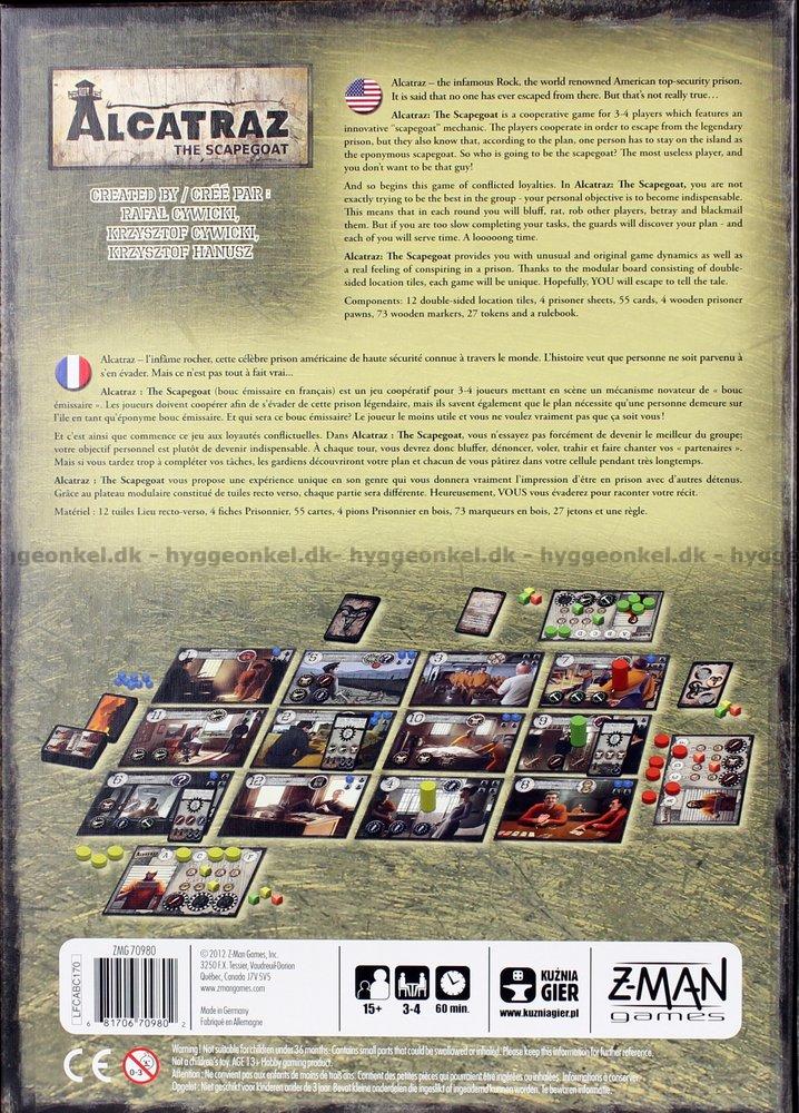 Alcatraz - The Scapegoat är ett samarbetsspel för 3-4 spelare som innehåller en "syndabock"-mekanism. Spelarna ska försöka rymma från fängelset men en av spelarna blir tyvärr kvarlämnad.