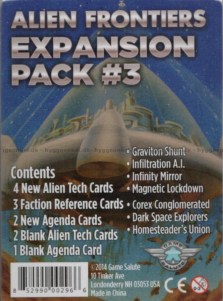 Med detta expansionspaket får du fler kort att använda i Alien Frontiers. Du måste ha grundspelet för att få glädje av expansionen.