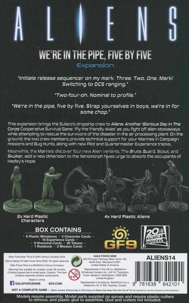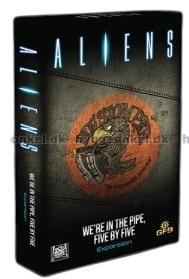 Med expansionen We're in the Pipe, Five by Five får du kort och miniatyrfigurer att använda i Aliens: Another Glorious Day In The Corps.