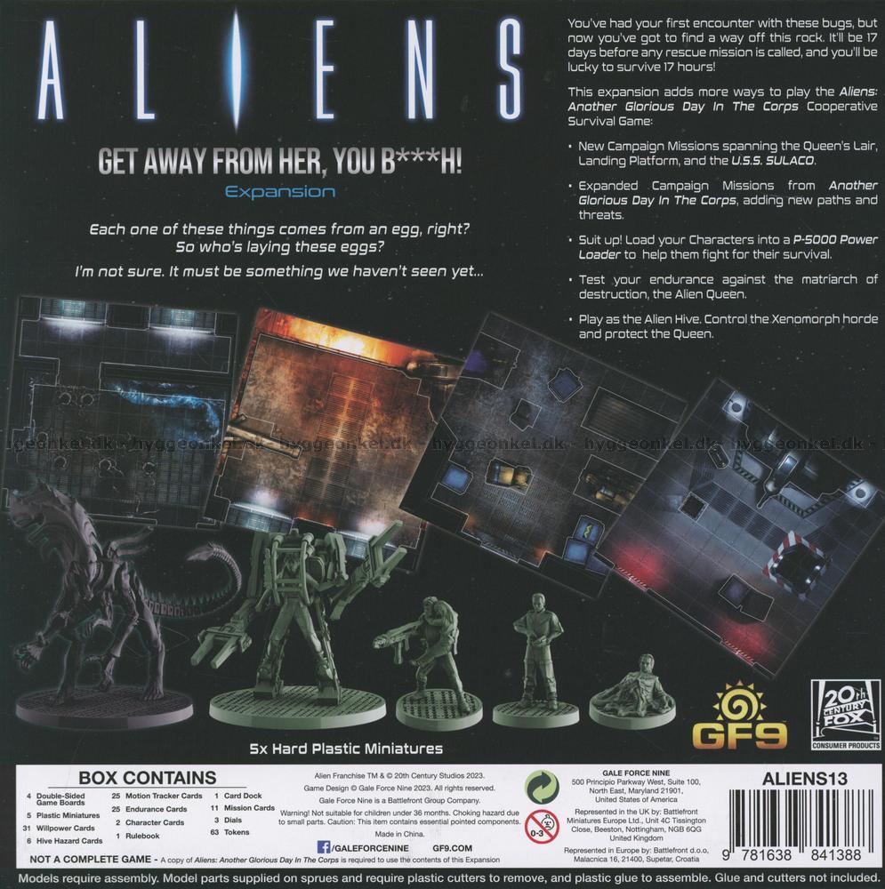 Med expansionen Get Away From Her You B***h får du kort, spelområden och miniatyrfigurer i plast att använda i Aliens: Another Glorious Day In The Corps.