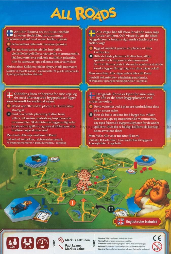 All Roads är ett idealiskt spel för dem som älskar att bygga och planera i en historisk miljö. Det kräver skicklighet, överblick och lite tur för att bemästra vägarna till seger i All Roads.