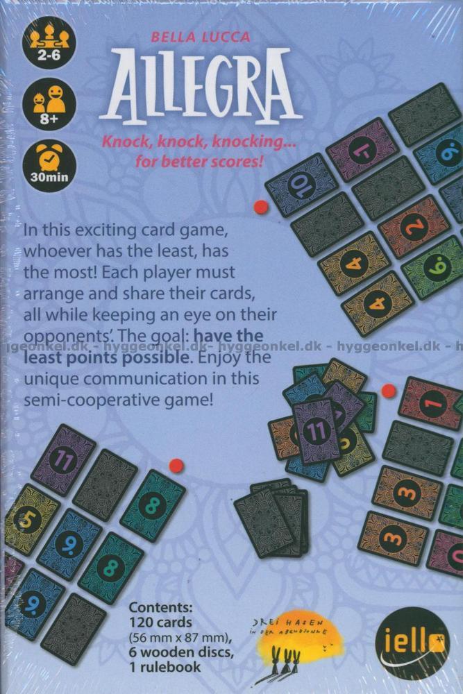 Allegra är ett unikt kortspel som ger en spännande twist på det välkända kortspelet Golf. Målet är att optimera din kortuppsättning genom att samla, byta, banka och rensa kort för att uppnå så låg poäng som möjligt efter tre omgångar. Varje spelare får 12 kort och spelar med totalt 15 kort genom att inkludera tre kort från sin vänstra granne, vilket kräver taktiskt tänkande.