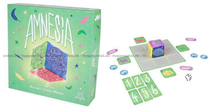 Spelbräde, Amnesia-kub, tärning, kort och brickor i kartong.