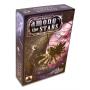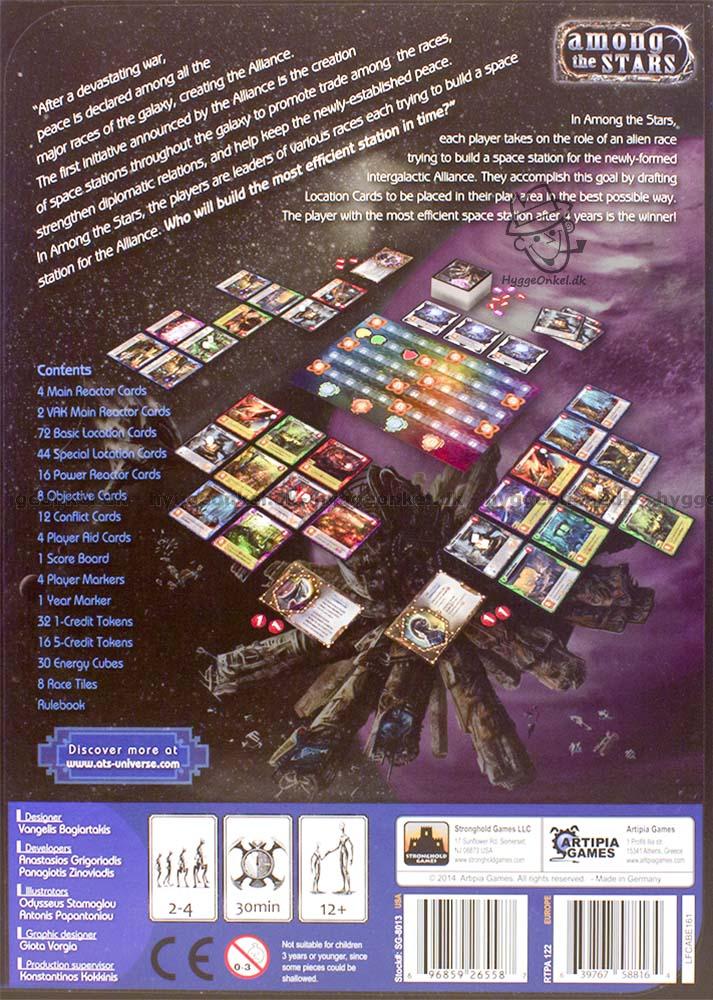 Kartongen för Among the Stars innehåller engelska spelregler, kort, spelbräde, marker och brickor.
