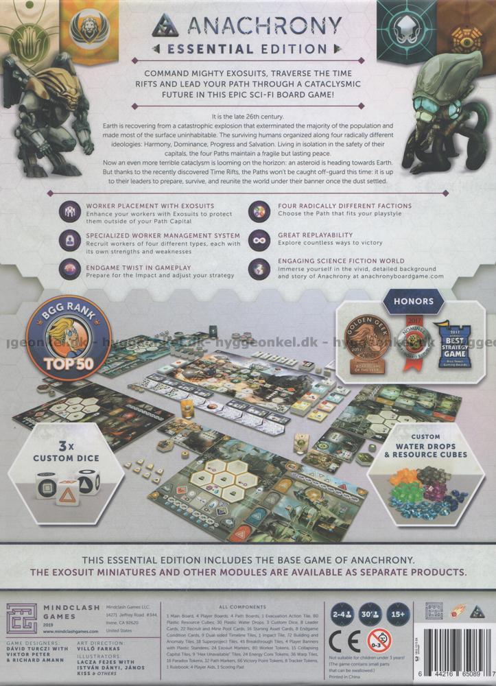 Anachrony har ett unikt worker placement-system i två lager. För att resa till The Capital eller färdas ut i ödemarken för att samla resurser ska spelarna inte bara använda rätt specialister (Engineers, Scientists, Administrators och Geniuses), utan också Exosuits för att skydda och förbättra - och båda delar är begränsade.