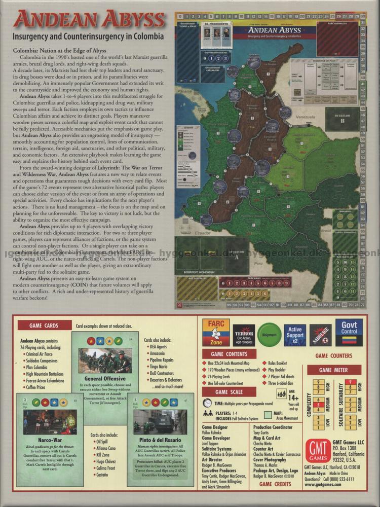 Reglerna och komponenterna säkrar att fokus är på spelet, men Andean Abyss bjuder också på en fängslande modell om uppror och kamp i Colombia. På ett elegant sätt tas höjd för befolkningskontroll, kommunikationslinjer, terräng, akuthjälp och en värld av andra politiska, militära och ekonomiska faktorer.