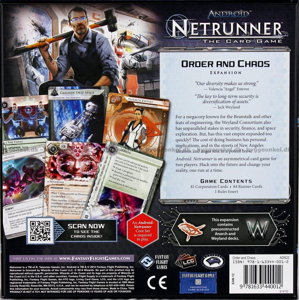 Asken består av 81 corporation cards samt 84 runner cards. Spelregler medföljer.