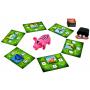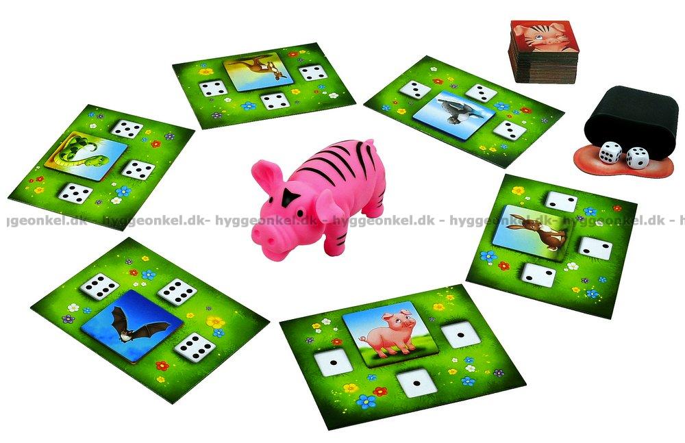 Kartongen innehåller 1 gris/zebragris, 6 spelplattor, 30 djurkort, 1 tärningsbägare med lock, 2 tärningar, 1 ritblock och en blyertspenna.