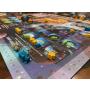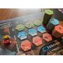 Spelområden, brickor i kartong, pjäser i plast, marker i trä och kort.