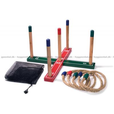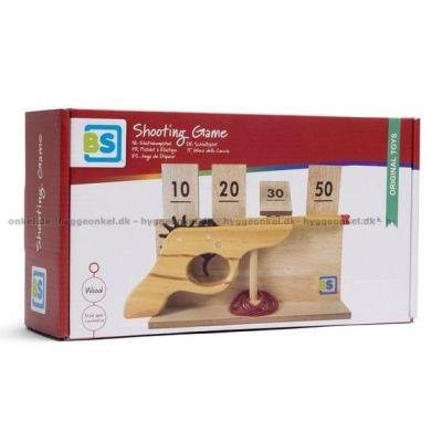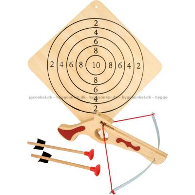 Måltavla (mäter 30 x 30 cm), armborst (mäter 31 cm) och 2 pilar med sugkopp (mäter 19 cm). Alla delar är i trä.