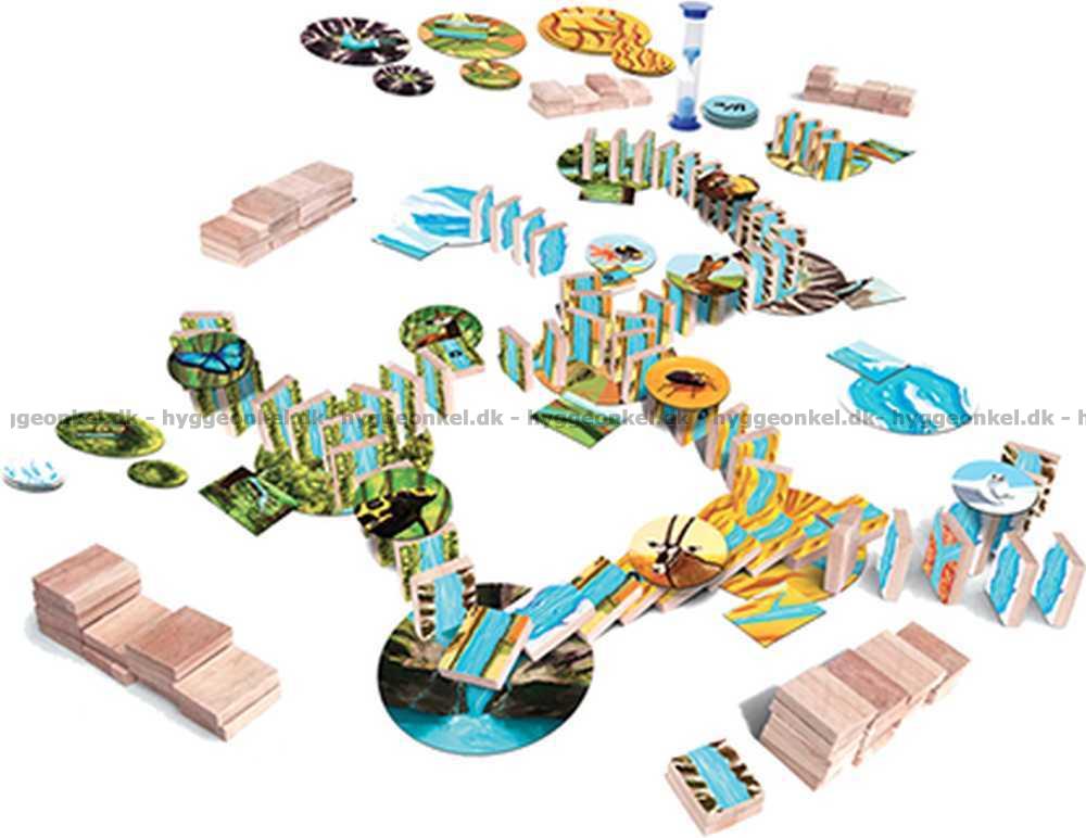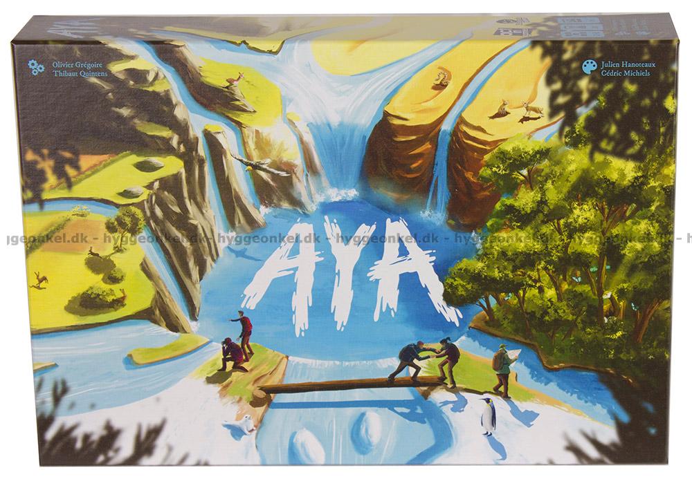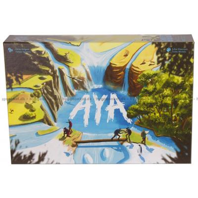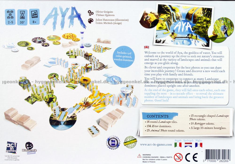 Aya är gudinna över vatten. I detta samarbetsspel ska ni förbinda landskapet med de många dominoträbrickorna, som i slutet av spelet ska välta för att avslöja det slutgiltiga landskapet.
