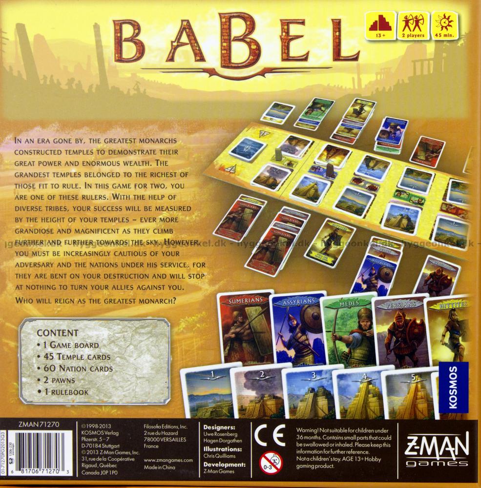 In ancient times, monarchs built temples to demonstrate their wealth. The highest temple belonged to the wealthiest monarch. In this two-player game by Uwe Rosenberg, you are one of these long-forgotten monarchs. With the help of various nations, your temples will grow more and more beautiful, reaching ever closer to the sky. But beware of your opponent and the nations on his side, for they will want to destroy your temples and convince your own people to change sides…