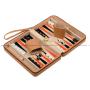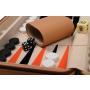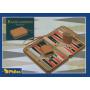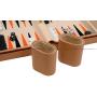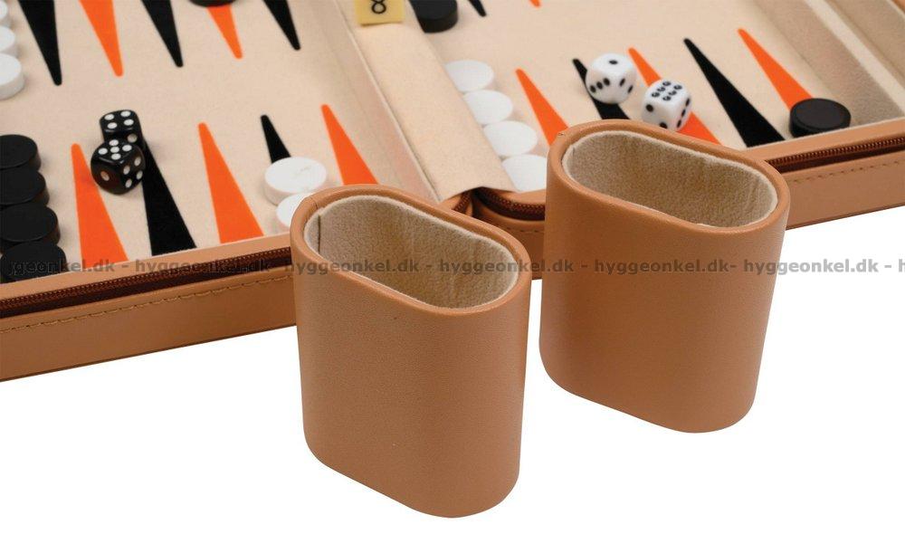 Kartongen innehåller ett backgammonspel i konstläder tillsammans med pjäser och tärningar.