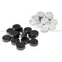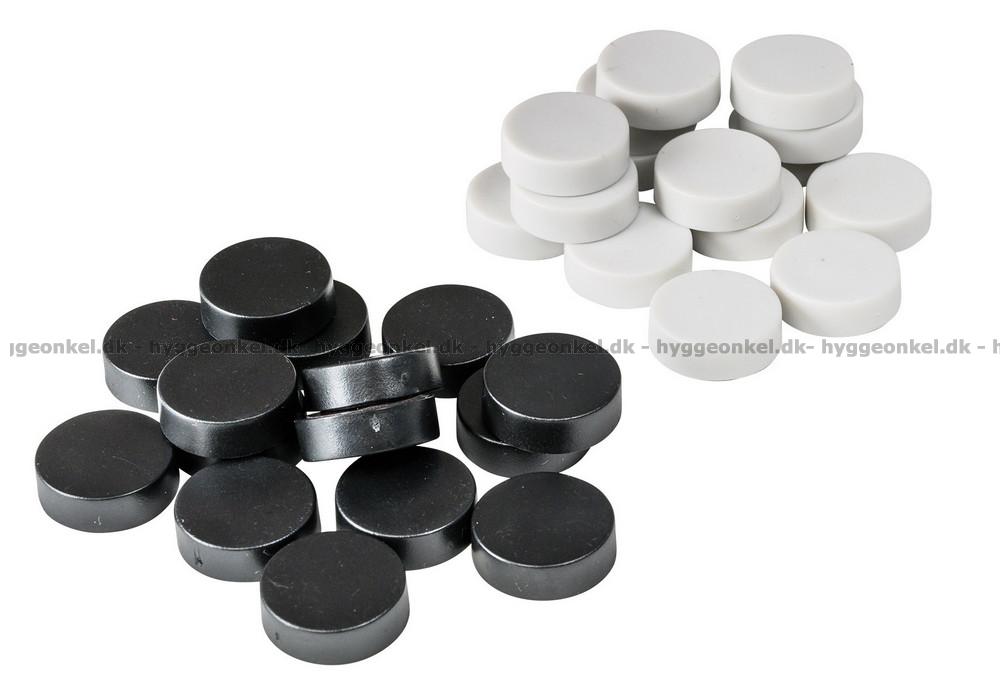 - Pjäserna är vita och svarta i plast och de mäter cirka 2 cm i diameter och är 0,5 cm höga.