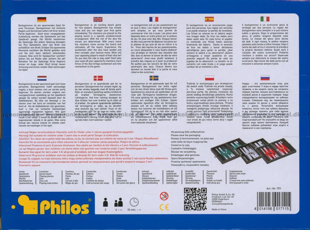 Kartongen innehåller ett backgammonspel tillsammans med pjäser och tärningar.