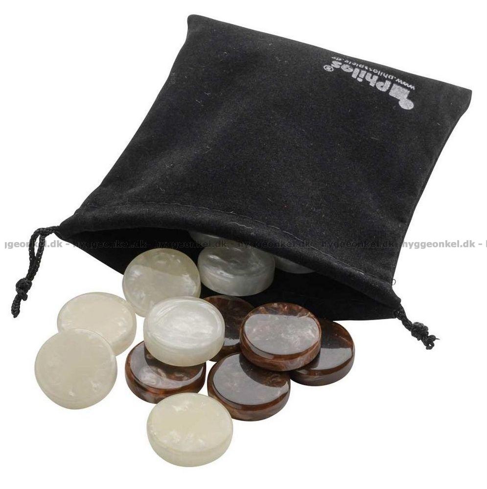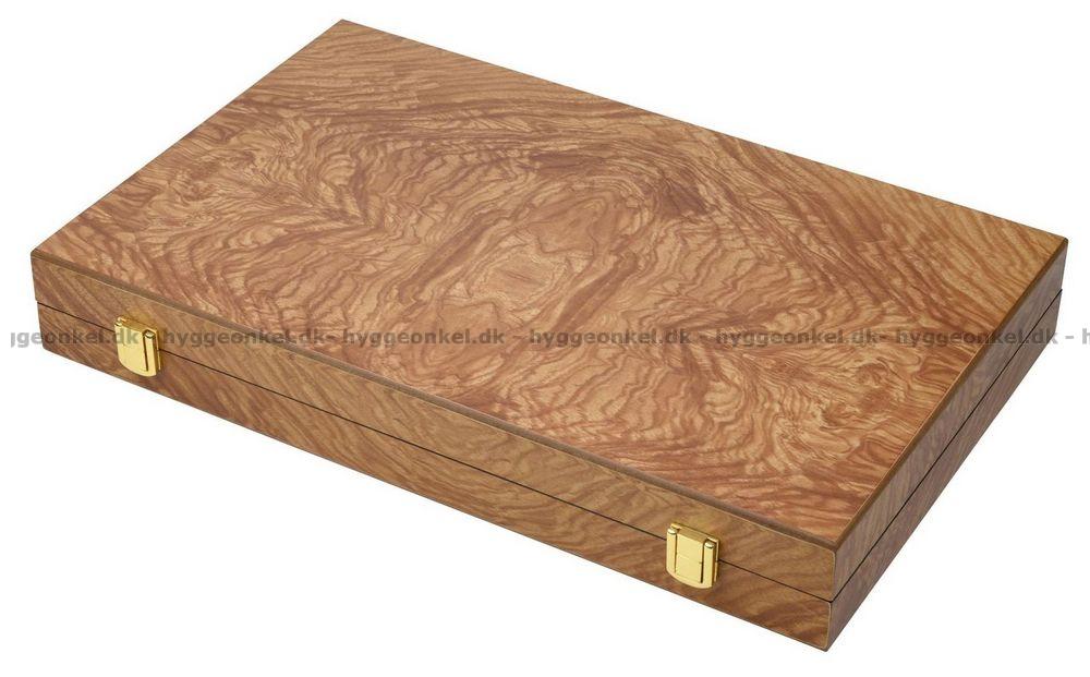 Asken innehåller ett backgammonspel, brickor och tärningar.