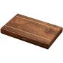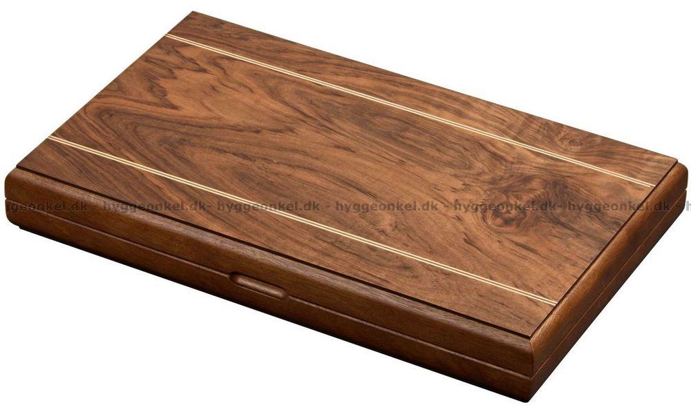 Asken innehåller ett backgammonspel samt brickor, tärningar och tärningsbägare.