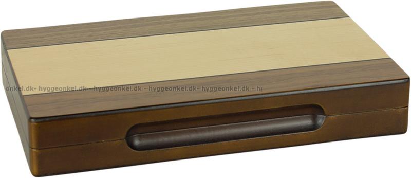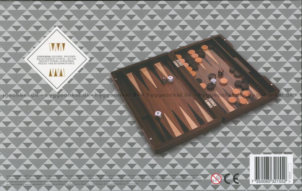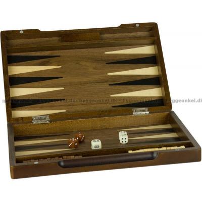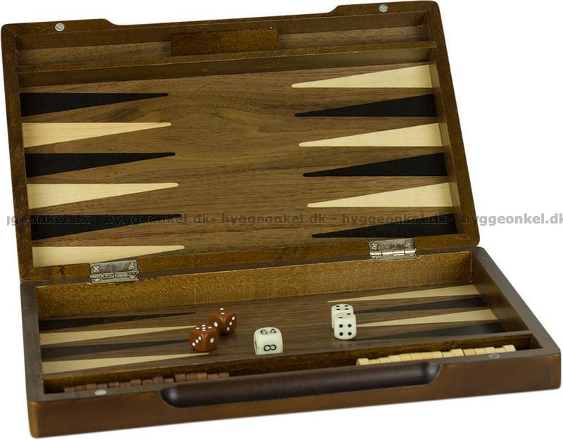 Vackert backgammonspel i rent trä. Det är bara tärningarna som inte är av trä.