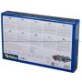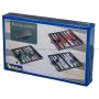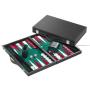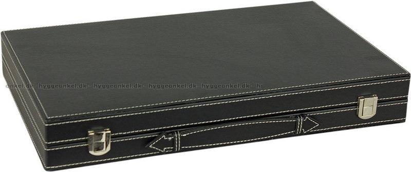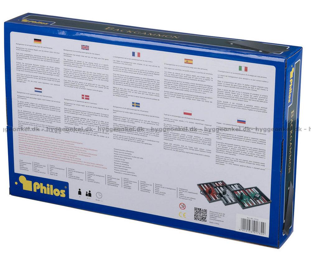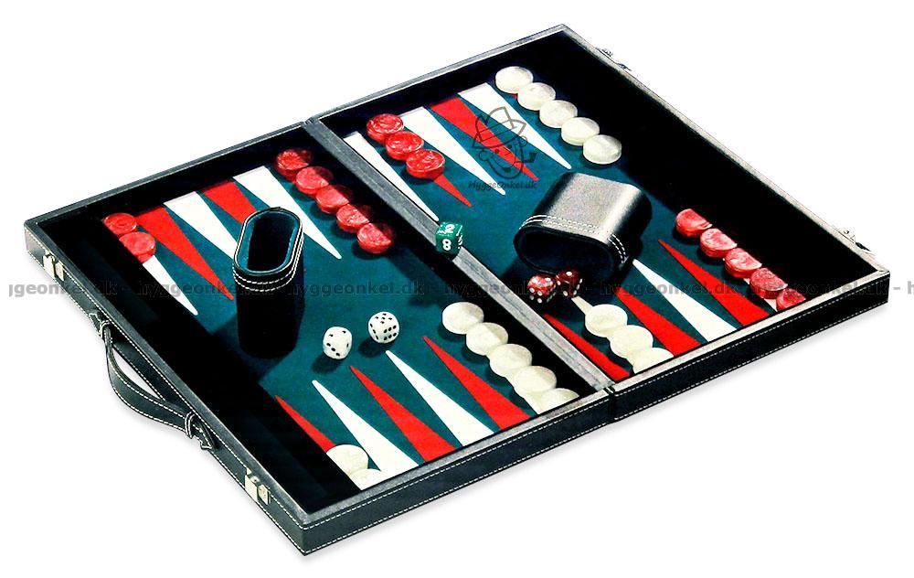 Kartongen innehåller ett backgammonspel tillsammans med pjäser, tärningar och tärningsbägare.