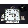Spelplattor, brickor i kartong samt pjäser och marker i plast.