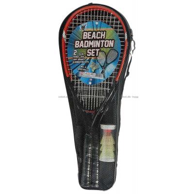 I väskan ligger 2 racketar (lite mer robusta än vanliga badmintonracket), 3 badminton-bollar i plast (något tyngre än vanliga badminton-bollar så de inte så lätt tas av vinden när ni spelar utomhus).
