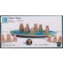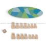 Spelområde i trä (mäter 35 x 12 x 2 cm), 14 träfigurer (mäter 7 x 4 x 1,5 cm) och 1 tärning.