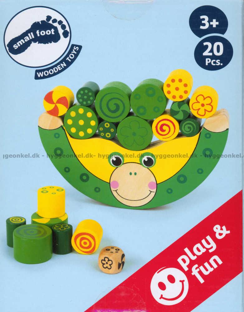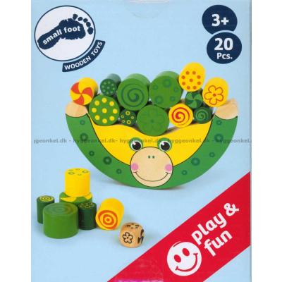 Den söta grodan ligger och gungar. Kan du lyckas placera brickor på den utan att den välter?
