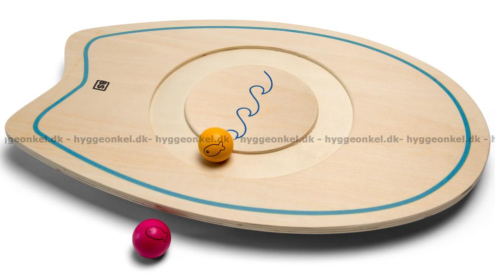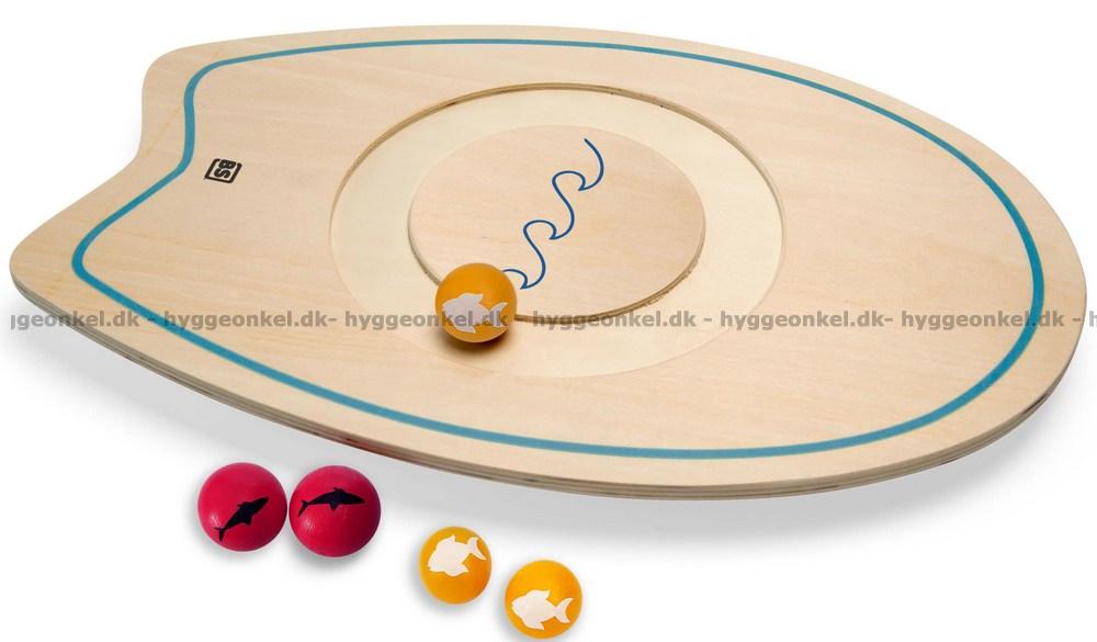 På mitten av brädet finns en fördjupning som de medföljande bollarna kan åka runt i. På några av bollarna finns bilder av fiskar - på andra bilder av hajar.