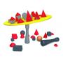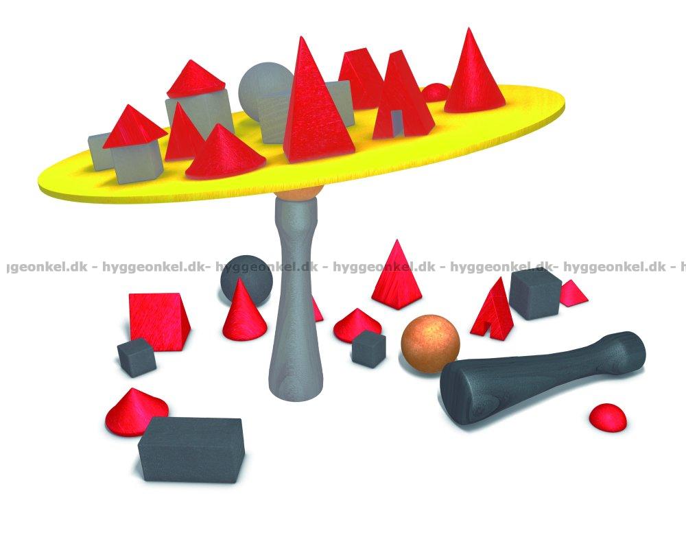 I kartongen hittar du den stora runda plattan, 25 träklossar, en stolpe av trä och en kula. Plattan ska balansera på stolpen och kulan.