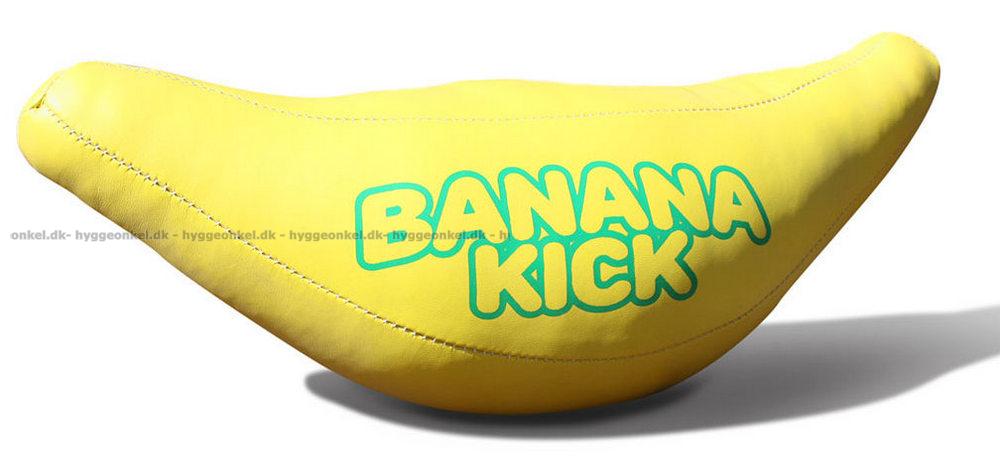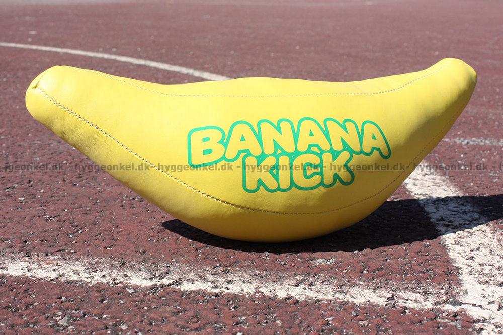 1 mjuk bananboll i läderimitation (bollen väger cirka 550 g och mäter 32 x 10 cm) samt 4 målpinnar i trä.