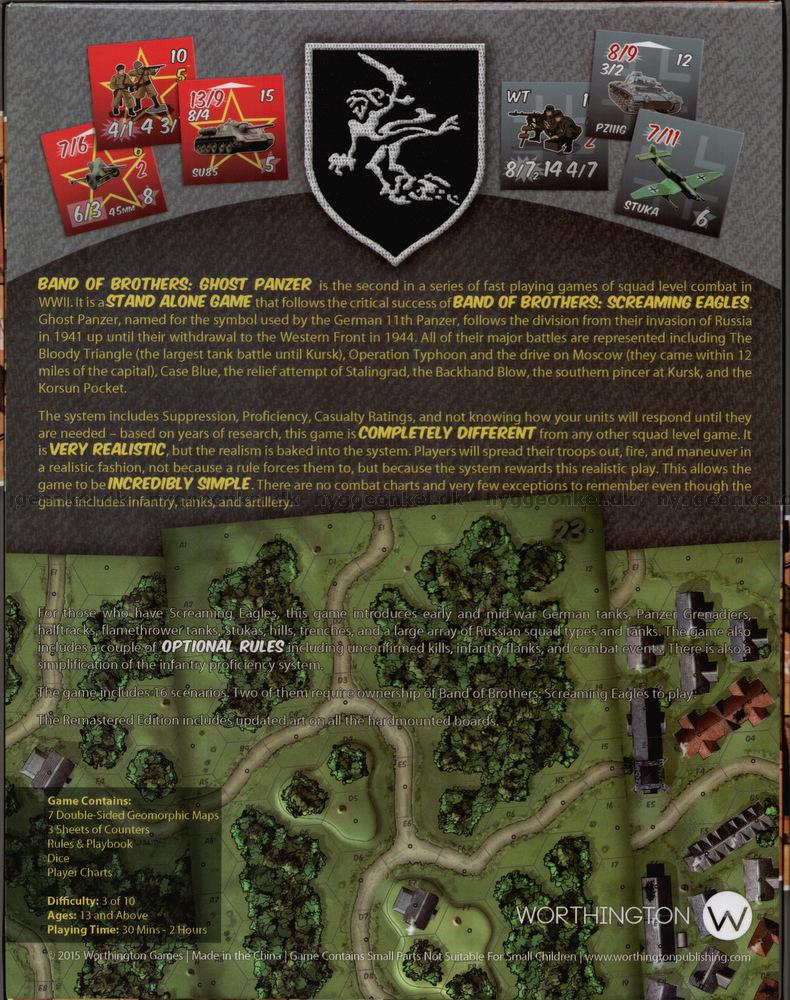 Band of Brothers: Ghost Panzer is a fast playing game of squad level combat in WWII. It covers the exploits of the German 11th Panzer Division in Russia from 1941 to 1944. The rules are very simple (no combat charts are needed) with very few exceptions to remember and yet the game is meant to be all encompassing and will include infantry, tanks, and artillery.