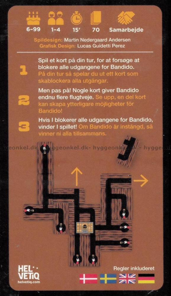 Ni är alla i samma lag och vinner bara om ni lyckas blockera alla utgångar innan kortleken tar slut. Men se upp – ett enda felaktigt kort kan öppna nya flyktvägar och göra det omöjligt att vinna. Spänningen stiger ju närmare Bandido kommer friheten.