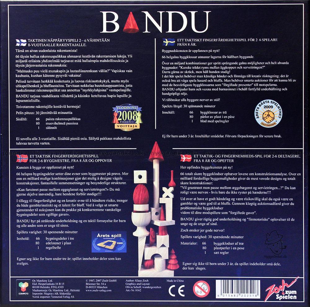 I Bandu turas spelarna om att välja en kloss och ge den till en motspelare. Mottagaren av klossen kan välja att placera klossen på sitt eget torn eller neka att ta emot den. Om spelaren nekar får man böta ett antal "bönor" varefter klossen ges vidare till nästa spelare som får göra samma val.