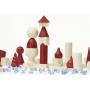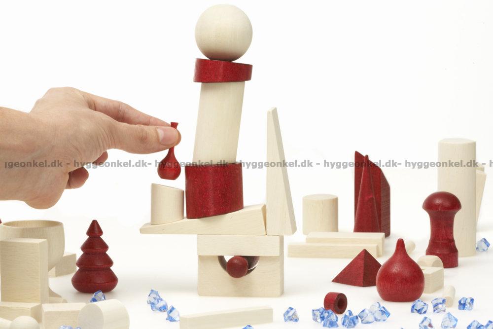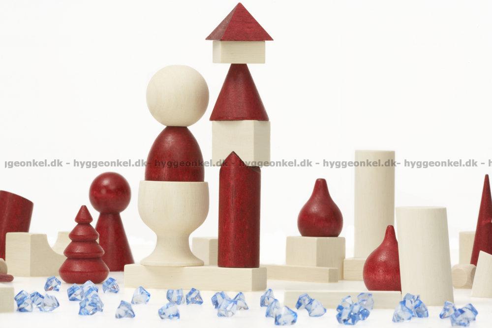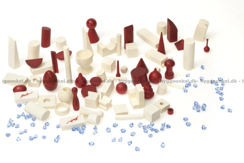 Kartongen innehåller 66 byggklossar i olika former, 80 plastpärlor ("bönor") och spelregler på svenska.
