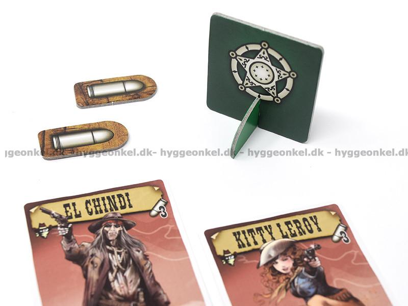 40 kort, 12 karaktärskort, 1 Renegade-marker och 10 patronmarker.