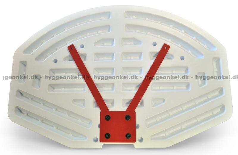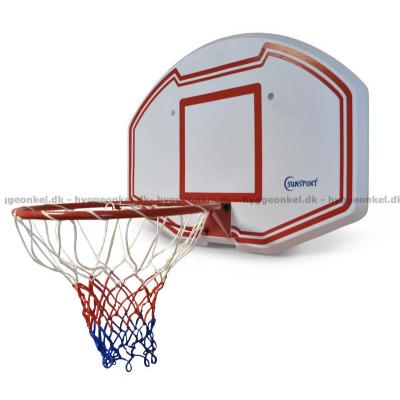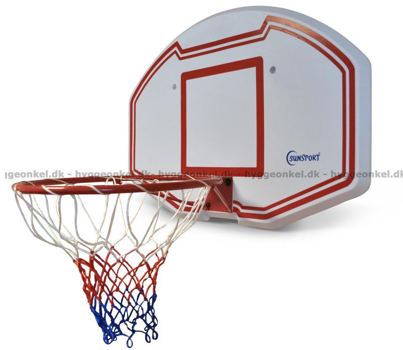 Här får du en basketkorg med en diameter på 45 cm. Den sitter på en platta som mäter 90 x 60 x 3 cm.