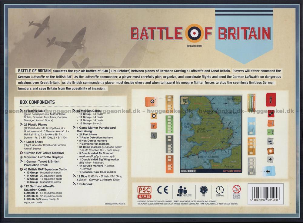 Battle of Britain är en ny och uppdaterad version av det klassiska spelet från TSR, som tar de fantastiska reglerna från originalet och gör dem ännu bättre med smidigare luftstrider, regler för bränsle och möjligheter att spela kortare scenarier på 1-2 timmar i tillägg till den kompletta kampanjen som tar 3-4 timmar.