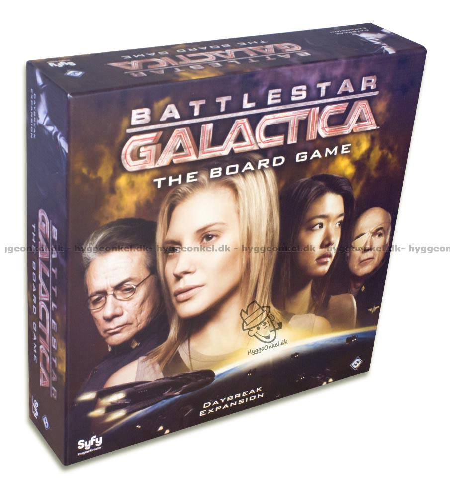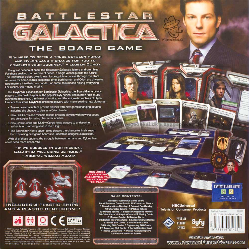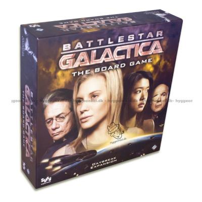 Battlestar Galactica: Daybreak Expansion brings humanity's plight to its gripping climax. With two supplemental game boards, twelve new character sheets, thirty new Crisis cards, twenty-five new Skill cards, and much more, Daybreak invites players to undertake desperate missions, struggle under the constant threat of mutiny (through the addition of a Mutineer card in the Loyalty deck that can affect either human or Cylon), and bargain with Cylon Leaders driven by motives of their own!